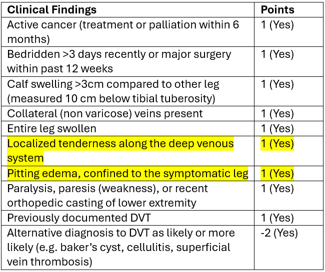 The Wells’ Criteria for DVT can be used in the outpatient and emergency department setting to risk stratify patients for DVT (9). It helps us determine the need for more testing to rule out DVT (e.g. D-dimer +/- ultrasound).
