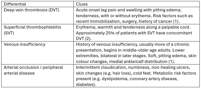 References AAFP: Anderson DR. Acute swelling of a limb. Am Fam Physician [Internet]. 2013 Jul 15 [cited 2025 Jan 12];88(2):102-7. Available from: https://www.aafp.org/pubs/afp/issues/2013/0715/p102.html#:~:text=Acute%20swelling%20of%20a%20limb,(Figures%201%20and%202).THROMBOSIS CANADA: Thrombosis Canada. Superficial Thrombophlebitis [Internet]. Toronto (ON): Thrombosis Canada; [cited 2025 Jan 12]. Available from: https://thrombosiscanada.ca/clinical_guides/pdfs/90_26.pdfMerck Manual Professional. Lymphangitis. 2023 [cited 2025 Jan 12]. Merck Manuals [Internet]. Available from: https://www.merckmanuals.com/en-ca/professional/dermatologic-disorders/bacterial-skin-infections/lymphangitisMerck Manual Professional. Baker cysts: Etiology [Internet]. Merck Manuals; [cited 2025 Jan 12]. Available from: https://www.merckmanuals.com/en-ca/professional/musculoskeletal-and-connective-tissue-disorders/bursa-muscle-and-tendon-disorders/baker-cysts#Etiology_v63203480Compartment syndrome: Goyal A, Bansal P, Chaudhary S, Singh S, Goyal P. Cellulitis. In: StatPearls [Internet]. Treasure Island (FL): StatPearls Publishing; 2023 [cited 2025 Jan 12]. Available from: https://www.ncbi.nlm.nih.gov/books/NBK448124/Merck Manual Professional. Cellulitis: Etiology [Internet]. Merck Manuals; [cited 2025 Jan 12]. Available from: https://www.merckmanuals.com/en-ca/professional/dermatologic-disorders/bacterial-skin-infections/cellulitis#Etiology_v963517Merck Manual Professional. Necrotizing soft tissue infection: Pathophysiology [Internet]. Merck Manuals; [cited 2025 Jan 12]. Available from: https://www.merckmanuals.com/en-ca/professional/dermatologic-disorders/bacterial-skin-infections/necrotizing-soft-tissue-infection#Pathophysiology_v963932Thrombosis Canada. Deep vein thrombosis: Diagnosis [Internet]. Toronto (ON): Thrombosis Canada; [cited 2025 Jan 12]. Available from: https://thrombosiscanada.ca/clinical_guides/pdfs/DEEPVEINTHROMBOSISDIAGNOSIS_54.pdfMDCalc. Wells Criteria for DVT [Internet]. MDCalc; [cited 2025 Jan 12]. Available from: https://www.mdcalc.com/calc/362/wells-criteria-dvt#pearls-pitfallsBC Ministry of Health. Appendix B: D-dimer cut-off values [Internet]. Victoria (BC): BC Guidelines; [cited 2025 Jan 12]. Available from: https://www2.gov.bc.ca/assets/gov/health/practitioner-pro/bc-guidelines/appendix_b_-_d-dimer_cut-off_values.pdfThomas MR, Robinson SL, Busfield R, Williams J, Collins GS, Wright BJ. Characteristics and outcomes of patients with low risk pulmonary embolism defined by the simplified Pulmonary Embolism Severity Index (sPESI): a retrospective cohort study [Internet]. BMJ. 2022;376:e067378 [cited 2025 Jan 12]. Available from: https://www.bmj.com/content/376/bmj-2021-067378Maya S, Legrand M, Prat A, et al. Complete duplex ultrasound for diagnosing deep vein thrombosis: A comprehensive review. Thrombosis J [Internet]. 2023;21(1):1-9. [cited 2025 Jan 12]. Available from: https://thrombosisjournal.biomedcentral.com/articles/10.1186/s12959-023-00550-y