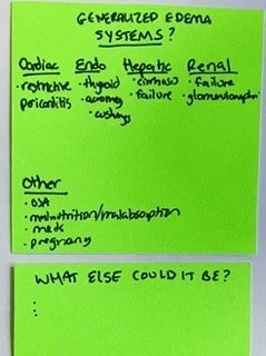 The systems framework generates differential diagnoses by considering the major systems of the human body and how they could contribute to the presenting complaint (e.g. integumentary, skeletal/muscular, nervous, endocrine, cardiovascular, lymphatic, respiratory/ENT, digestive, urinary, reproductive, hematological). This is when having foundational knowledge to apply to practice comes into play. If you have to look something up – do it! For generalized edema, you focus on the cardiac, endocrine, hepatic, and renal systems. I always like to include an “other” category for things that don’t quite fit major body systems. This also helps capture differentials I may otherwise have missed.
