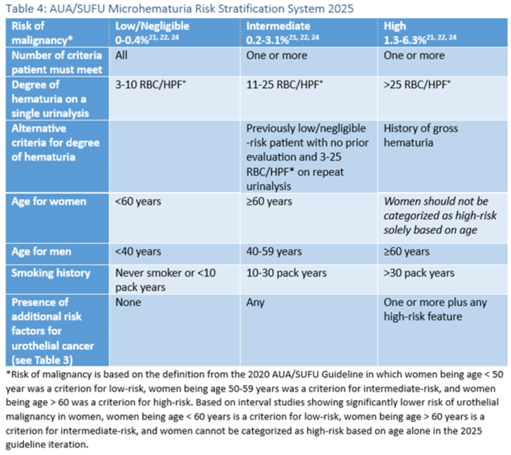 Step 4) Risk-stratify for malignancy: Not all microscopic hematuria needs the same intensity of workup. Use the 2025 AUA/SUFU Microhematuria Risk Stratification System to guide next steps. This framework incorporates age, sex, smoking history, degree of hematuria, and other risk factors to help determine who needs imaging and cystoscopy (1).