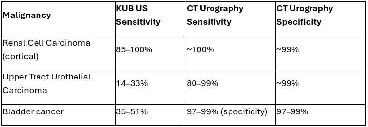 💡 Bottom line: KUB ultrasound performs reasonably well for renal cell carcinoma but is poor for upper tract urothelial carcinoma. For intermediate-risk patients, KUB US is recommended. For high-risk patients, CT urography is the gold standard.